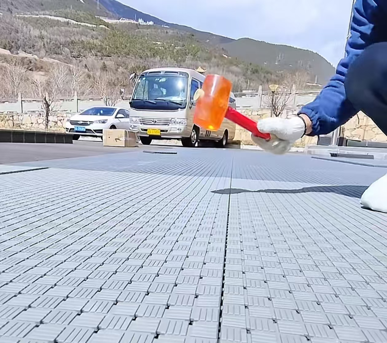 Surface: the surface layer of the classic rice word lattice design, beautiful and generous. Face layer unique skin grain anti-skid particle treatment, anti-dazzling, effectively increase the product friction. Lock buckle integrated design, reasonable use of space, effectively prevent thermal expansion and cold contraction, strengthen the connection strength. The 16 cubes on the surface layer are connected together by unique connecting bars. The independent small block design makes the floor fit with the ground better and reduces the requirements of the floor for the ground foundation.